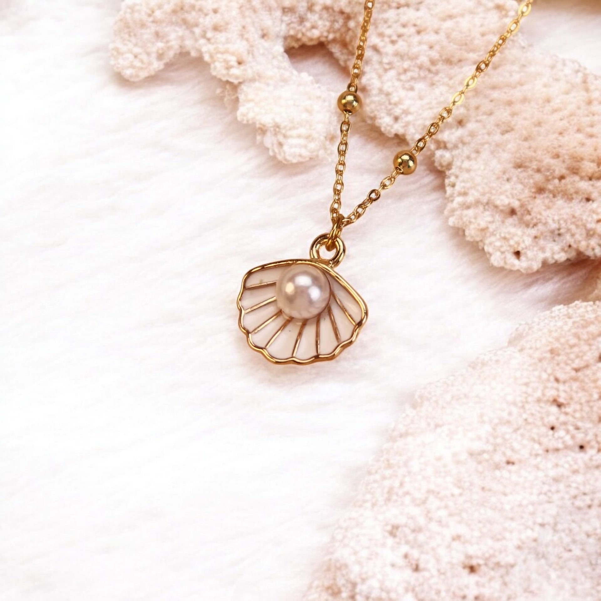 The Pearl Shell Necklace features a lustrous pearl and a natural shell charm delicately suspended on a fine gold chain. This timeless piece captures the gentle beauty of the sea, adding a touch of coastal elegance to any outfit.