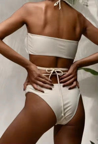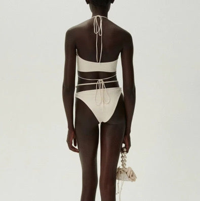Turn heads with this stunning statement bikini, designed for the modern island muse. Featuring a bandeau-style top with an elegant central pearl ring and cascading wrap-around straps adorned with lustrous pearls, this set redefines coastal sophistication. The high-cut bottoms elongate your figure, while the adjustable tie design allows for a custom, flattering fit.